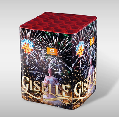 25 lanci di grosso calibro (Ø 30). Salici oro con stelle rosse e verdi. Stelle blu e rosse lampeggianti con finale veloce multicolor e oro.