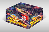 156 colpi (dritti e a ventaglio, Ø 20). Composto da 2 batterie: aperture assortite e lampeggianti con scie / aperture oro, cracker e blu con scie