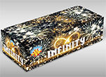 156 colpi (dritti e a ventaglio, Ø 20). Composto da 2 batterie: aperture assortite e lampeggianti con scie / aperture oro, cracker e blu con scie